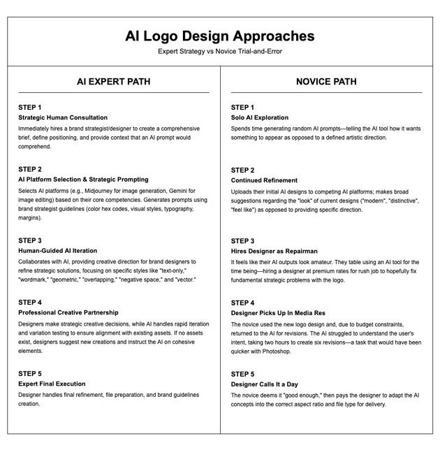 Let's parallel path a logo design project and see how an AI expert would approach it versus someone suffering from FOKU, compelled to use AI tools, who we’ll simply refer to as a novice.